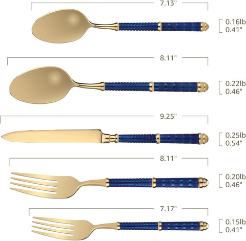 5Pcs 18/10 Stainless Steel Silverware Set Forged Manual Polishing Flatware Set Titanium Plated with Luxury Domee Handle Dishwasher Safe Home Hotel Restaurant Use Wedding Housewarming Gift Gold Blue
