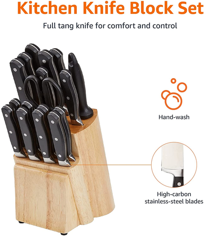 Amazon Basics 18-Piece Premium Kitchen Knife Block Set, High-Carbon Stainless Steel Blades with Pine Wood Knife Block