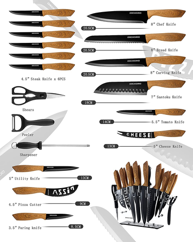 • Image of Dockorio Kitchen Knife Set with Block, 19 PCS High Carbon Stainless Steel Sharp Kitchen Knife Set Includes Serrated Steak Knives Set, Chef Knives, Bread Knife, Scissor, Sharpener, All in One Knife Set