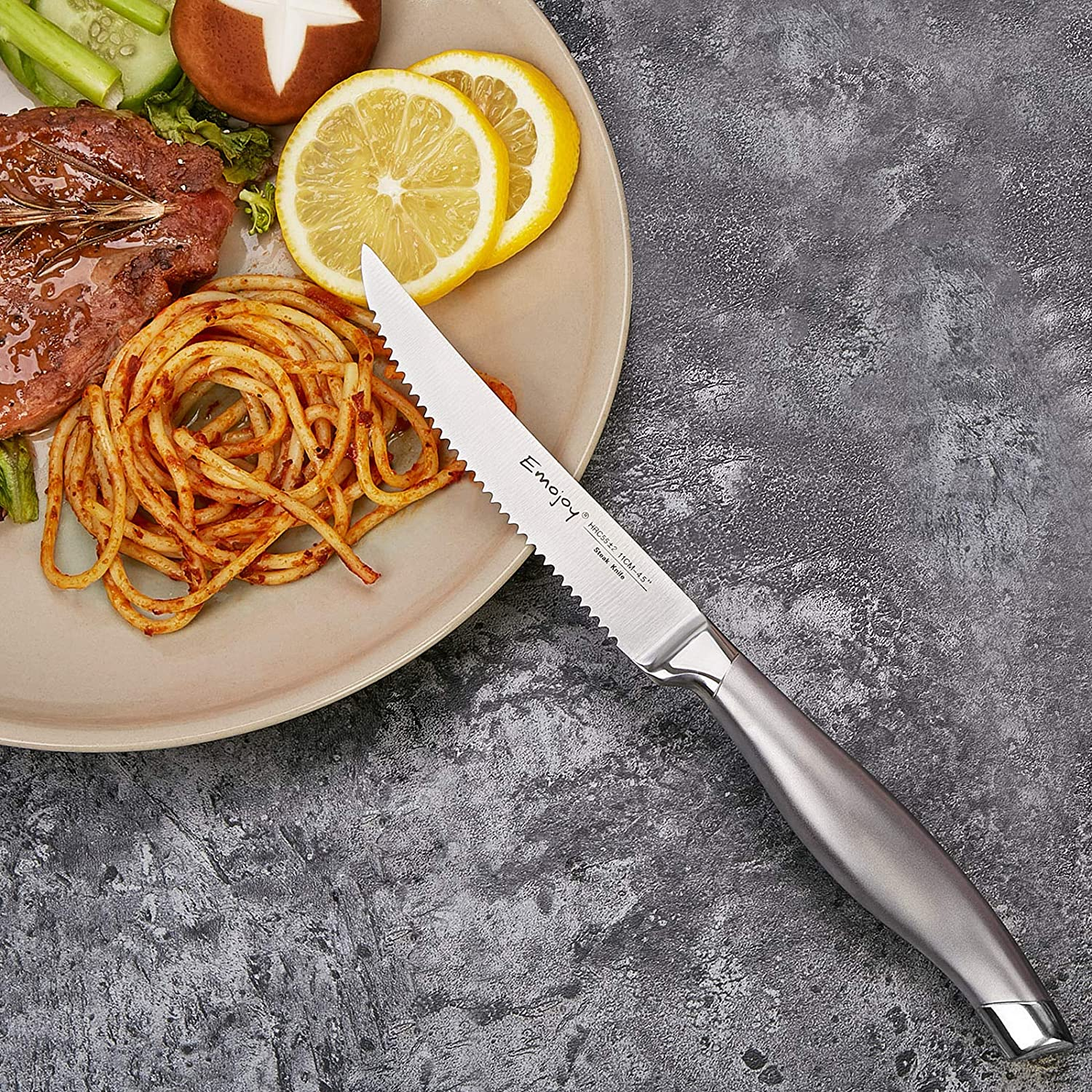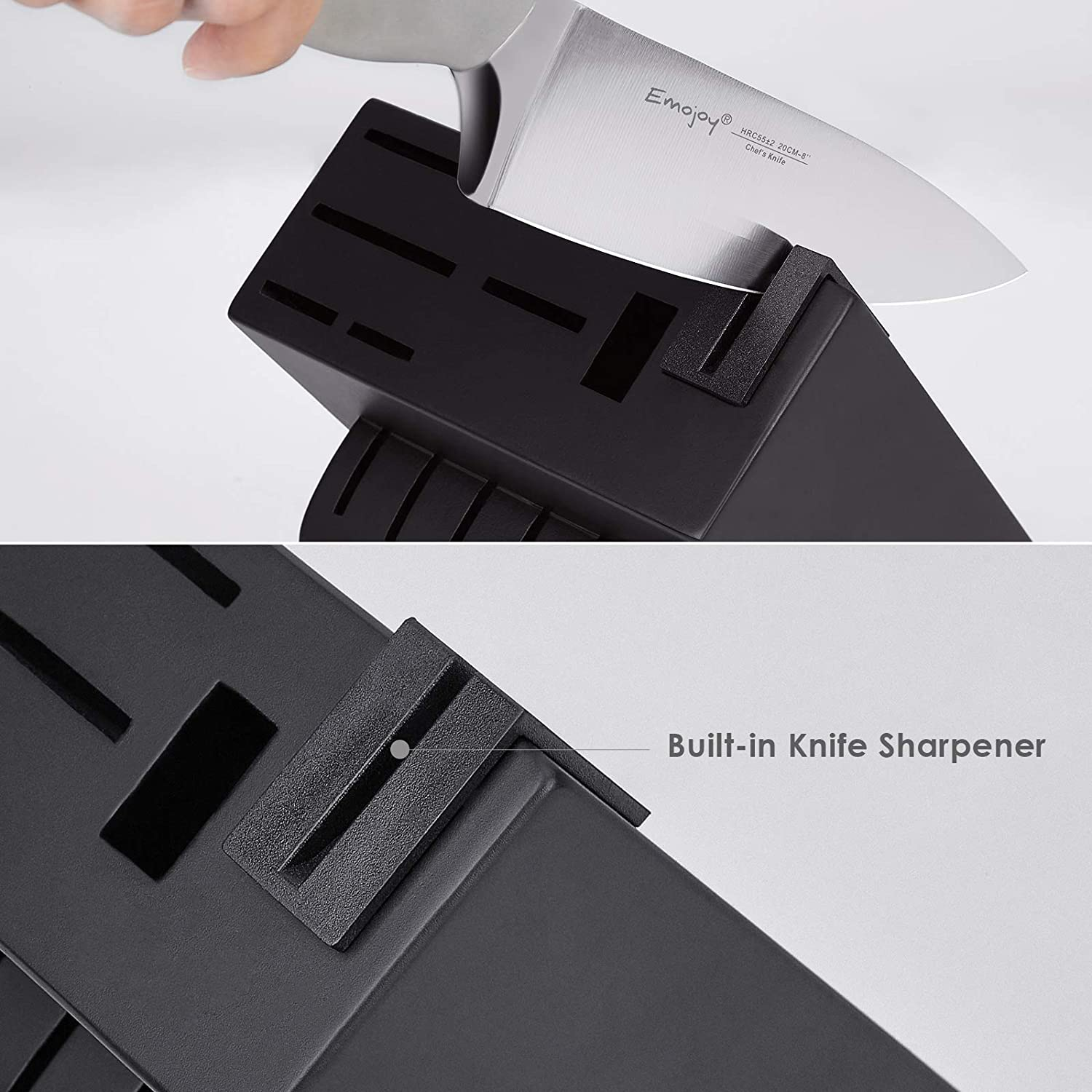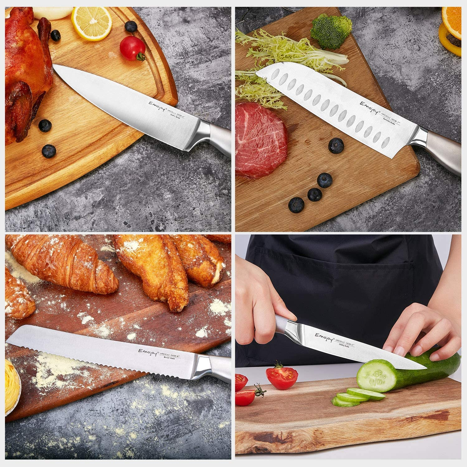 Emojoy Knife Set with Block, 15 Pieces Kitchen Knife Set with Built-In Sharpener, German Stainless Steel Sharp Chef Knife Set with Hollow Handle, Dishwasher Safe and Rust Proof, Grey