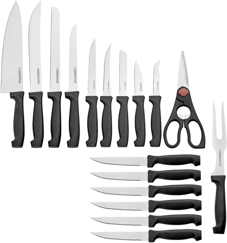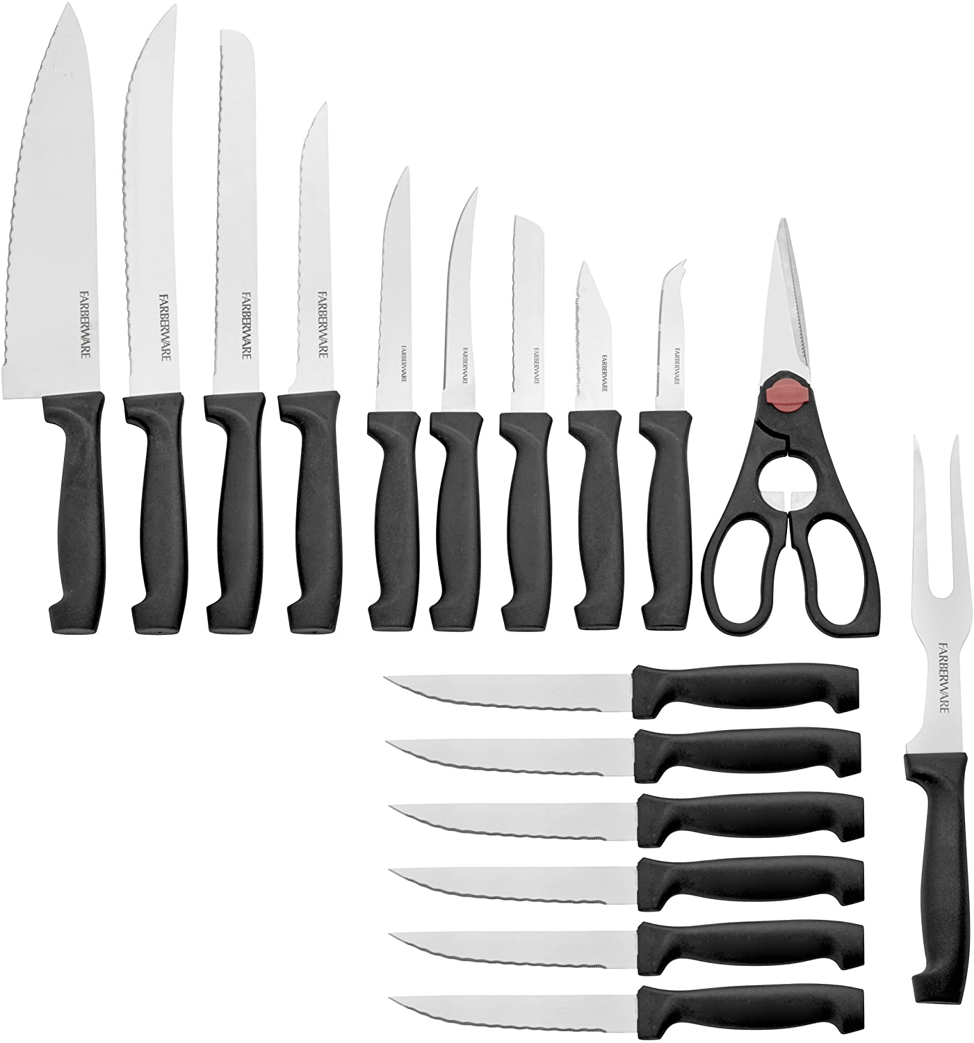 Farberware 18-Piece Never Needs Sharpening High-Carbon Stainless Steel Knife Block Set with Non-Slip Handles, Black