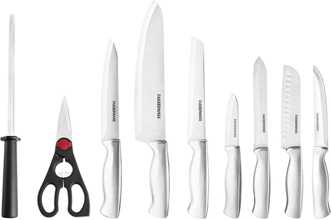 Farberware Stamped 15-Piece High-Carbon Stainless Steel Knife Block Set, Steak Knives, Black