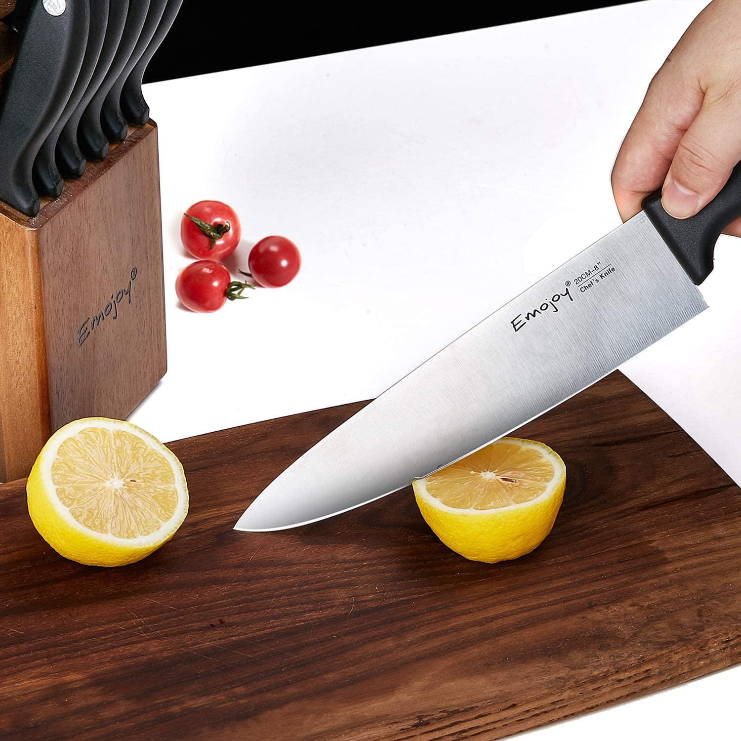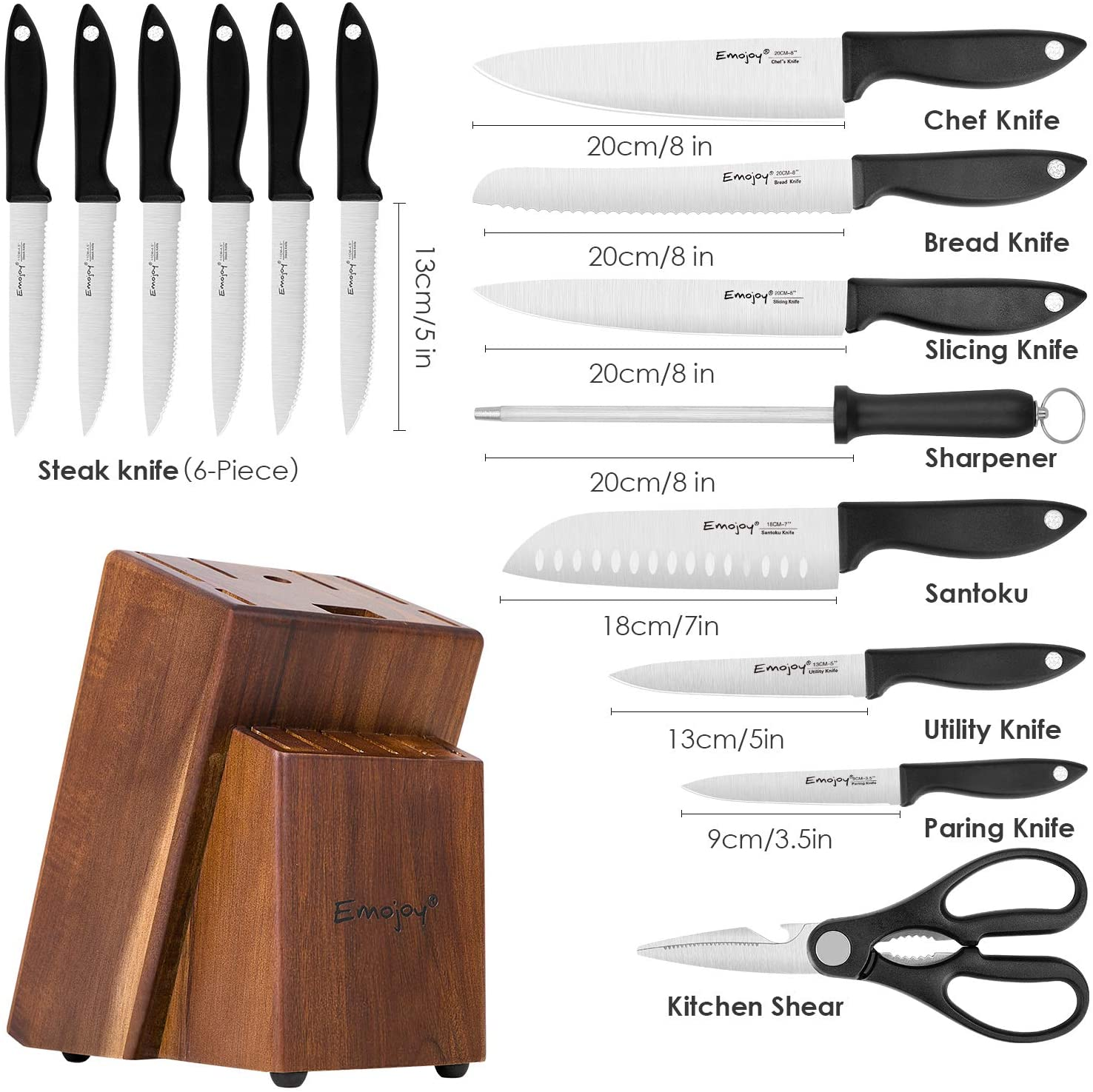 Knife Set 15-Piece Kitchen Knife Set with Sharpener Wooden Block and Serrated Steak Knives,Emojoy Germany High Carbon Stainless Steel Knife Block Set
