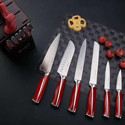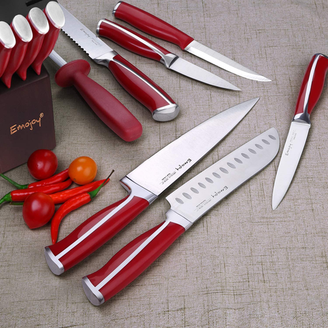 Knife Set, Emojoy 15 Piece Kitchen Knife Set with Block Wooden, German Stainless Steel Sharp Chef Knife Set with Sharpener, Dishwasher Safe and Rust Proof, Red, Black, Blue