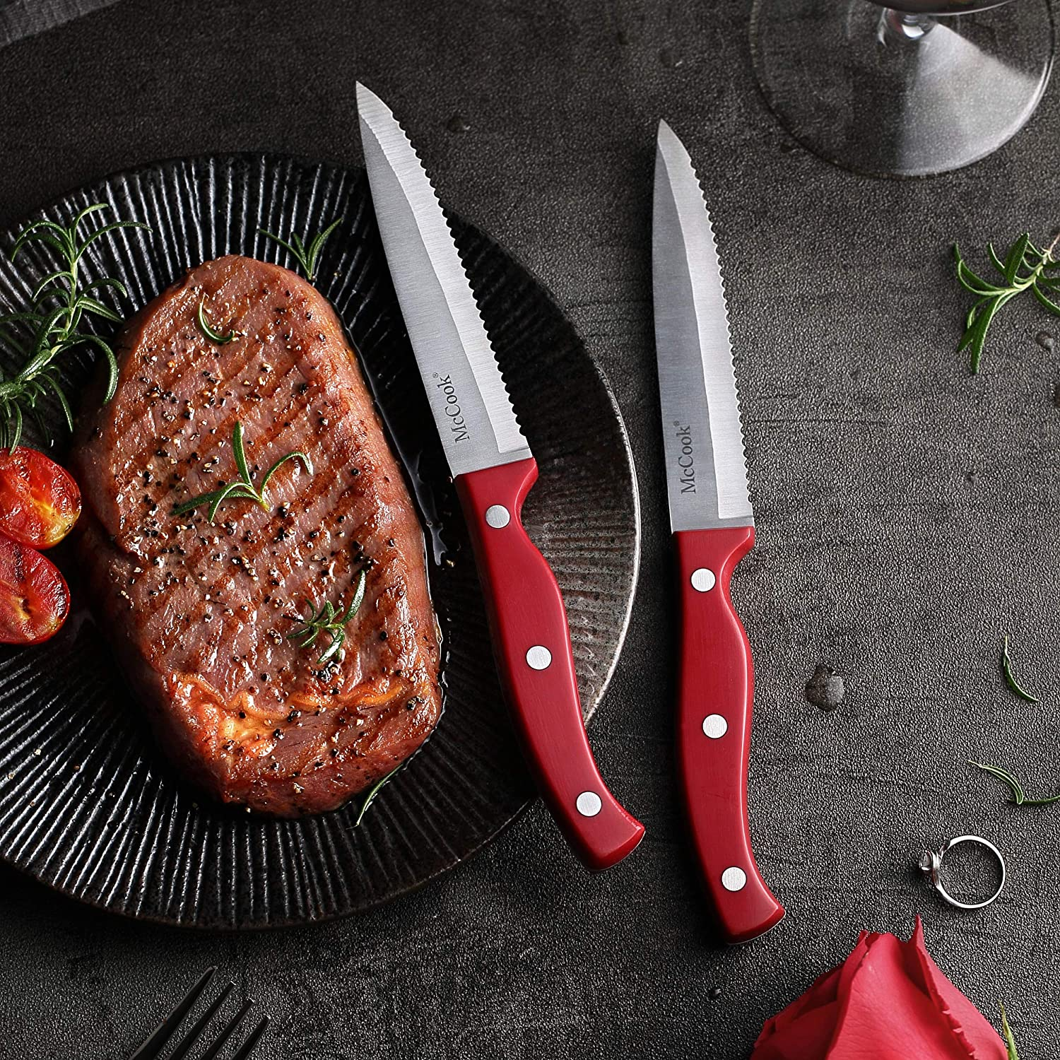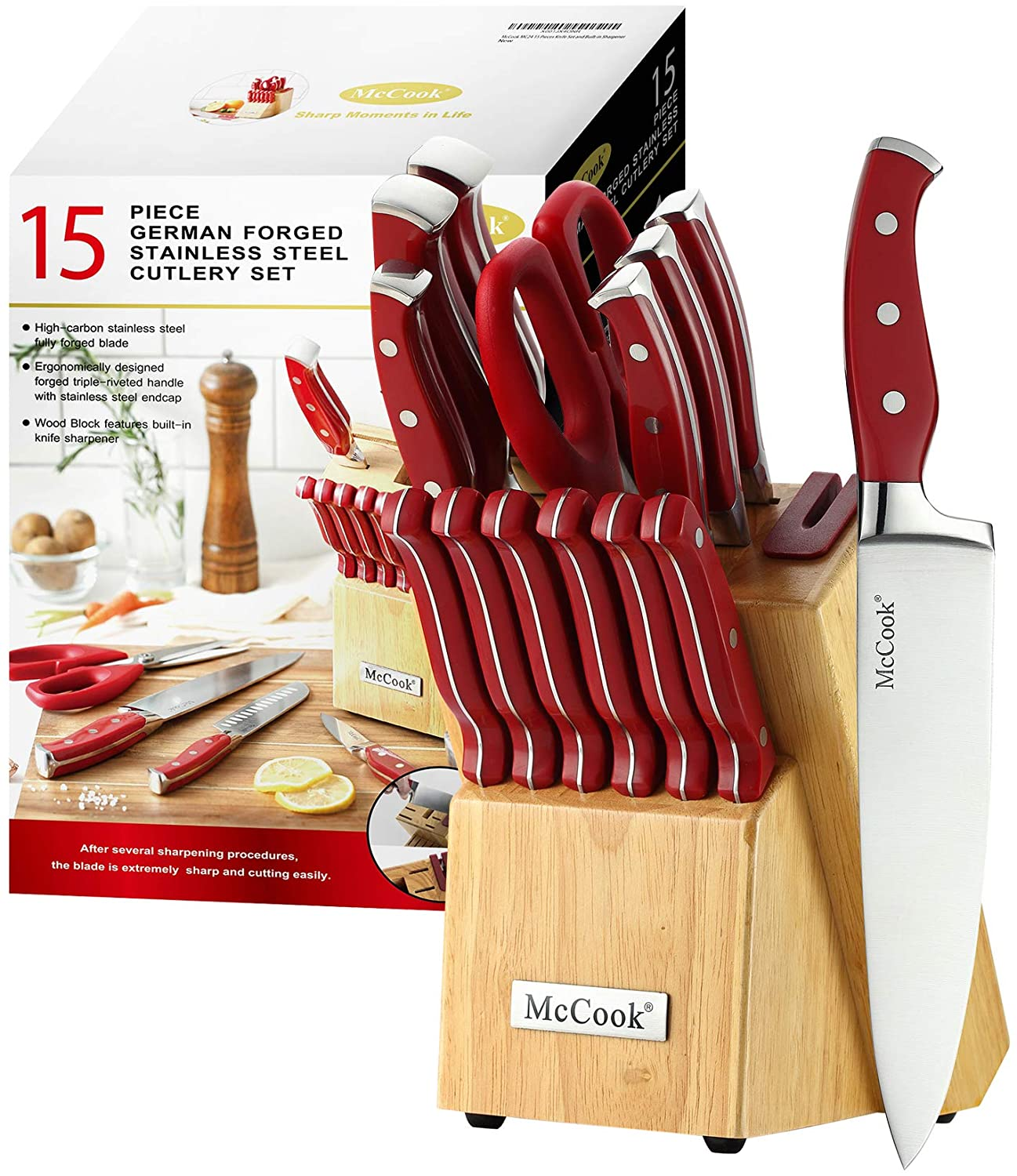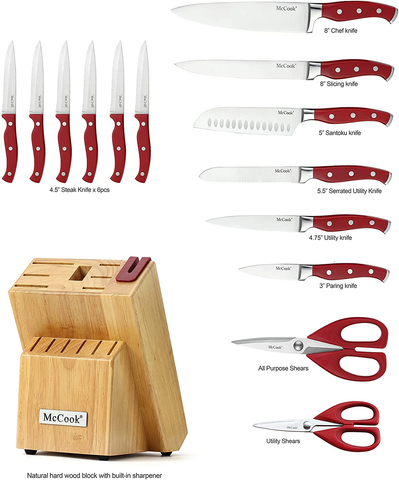 Mccook MC24 15 Pieces Stainless Steel Kitchen Knife Sets with Wooden Block, Kitchen Scissors and Built-In Sharpener, Red