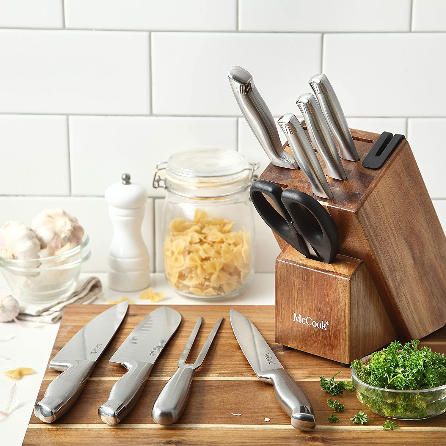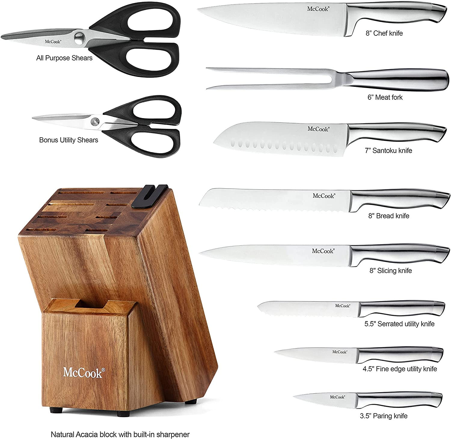 Mccook MC35 Knife Sets,11 Pieces German Stainless Steel Hollow Handle Self Sharpening Kitchen Knife Set in Acacia Block