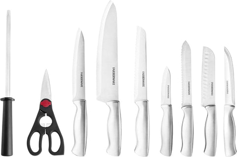 Stamped 15-Piece High-Carbon Stainless Steel Knife Block Set, Steak Knives & 3-Piece Bamboo Cutting Board, Set of 3 Assorted Sizes, Brown