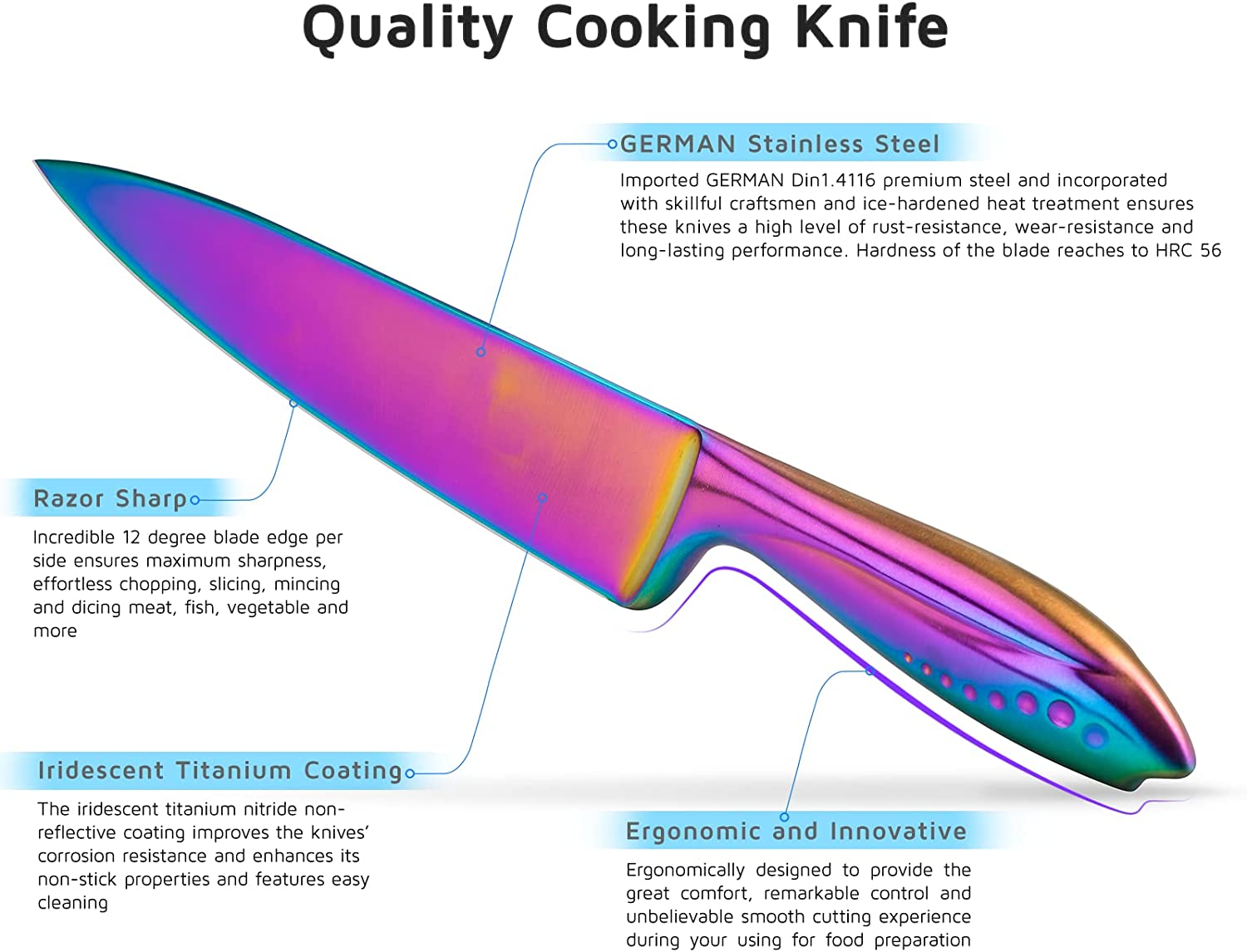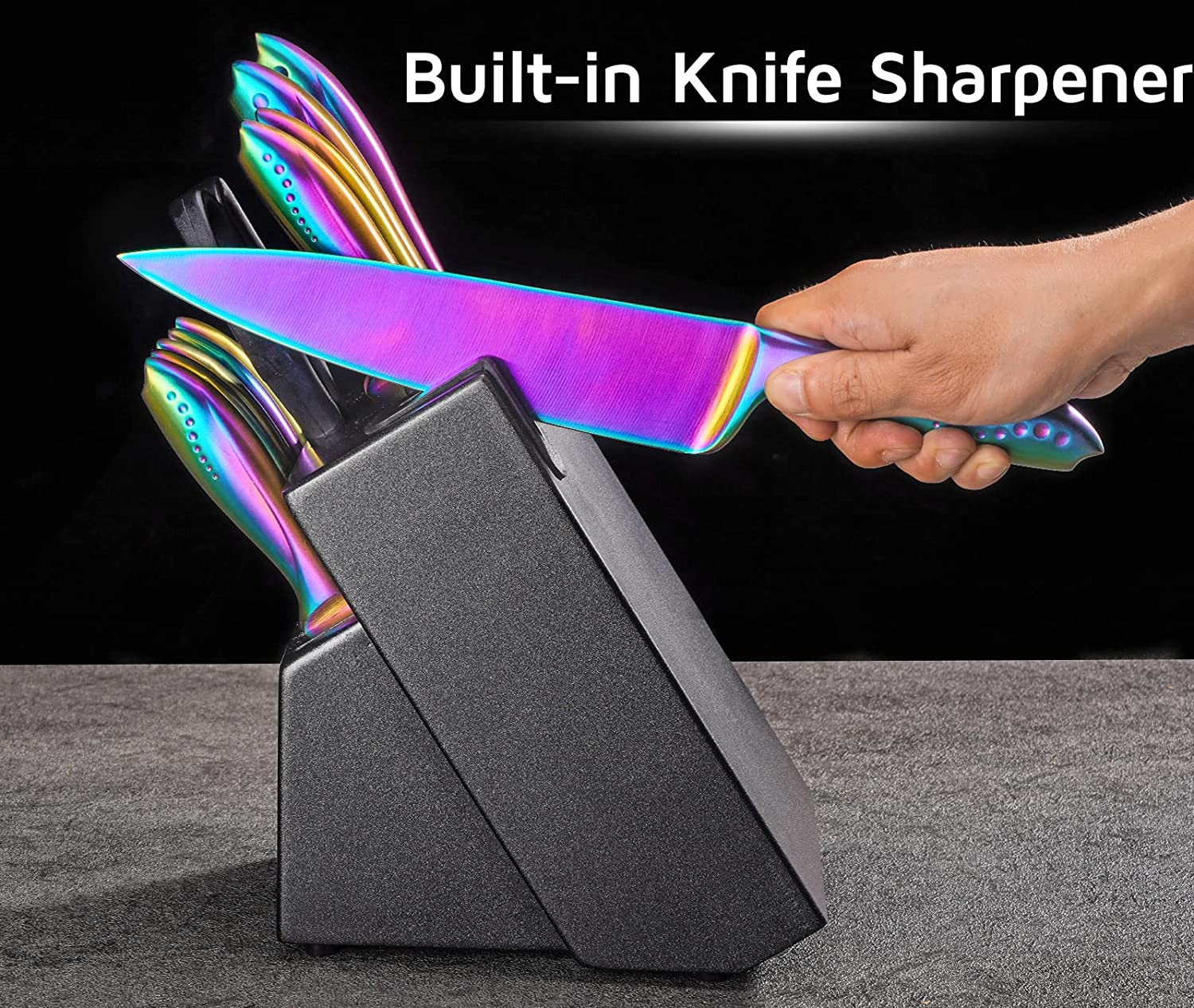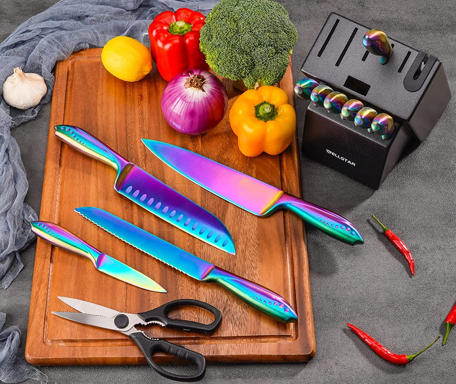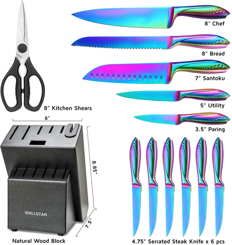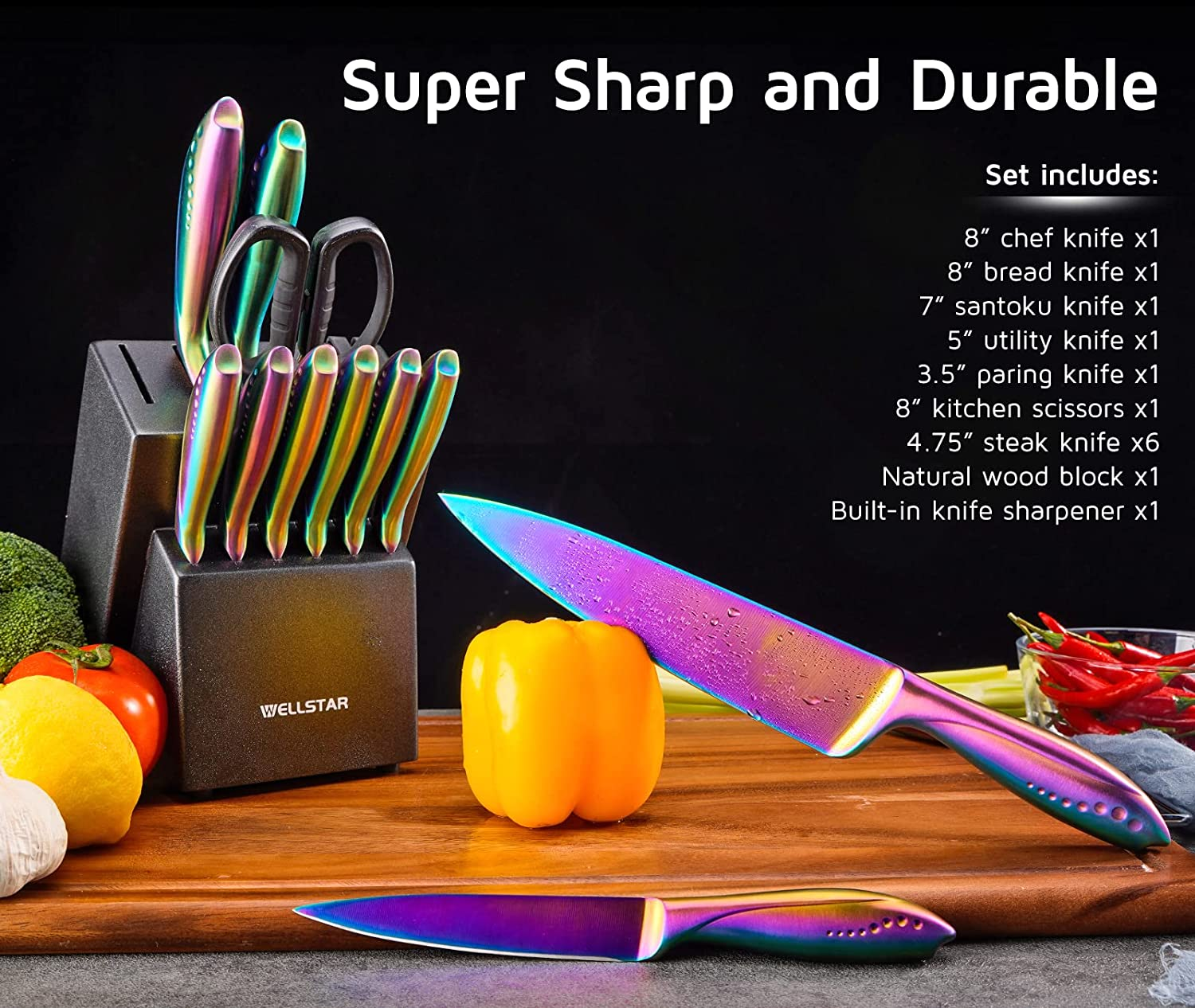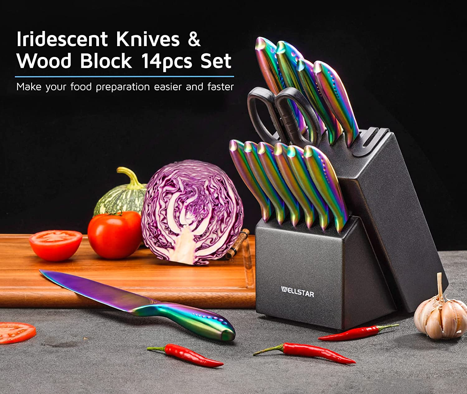 WELLSTAR Rainbow Knife Set 14 Pieces, Iridescent German Stainless Steel Kitchen Knives Set with Wooden Block, Colorful Titanium Coating, Chef’S Knife Block Set with Scissors and Built-In Sharpener