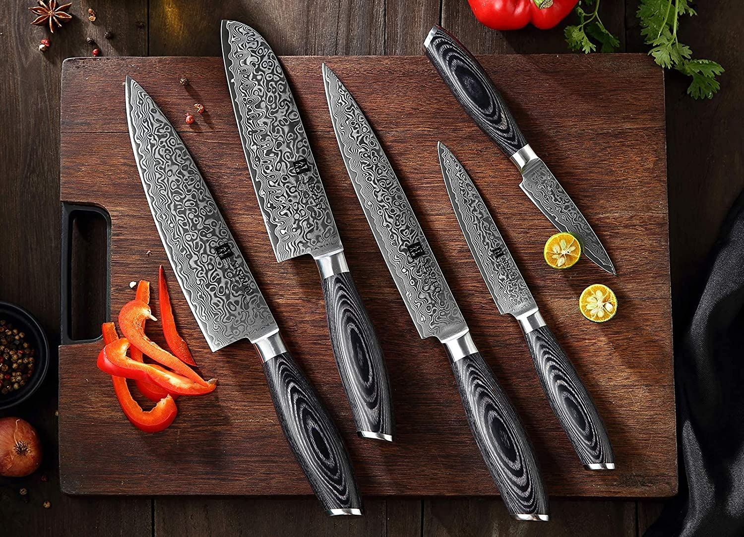 XINZUO 7PC Damascus Steel Knife Block Sets, Professional High Carbon Steel Chef Knife Santoku Slicing Utility Fruit Knife with Multifunctional Kitchen Shears,Ergonomic Pakkawood Handle - Ya Series